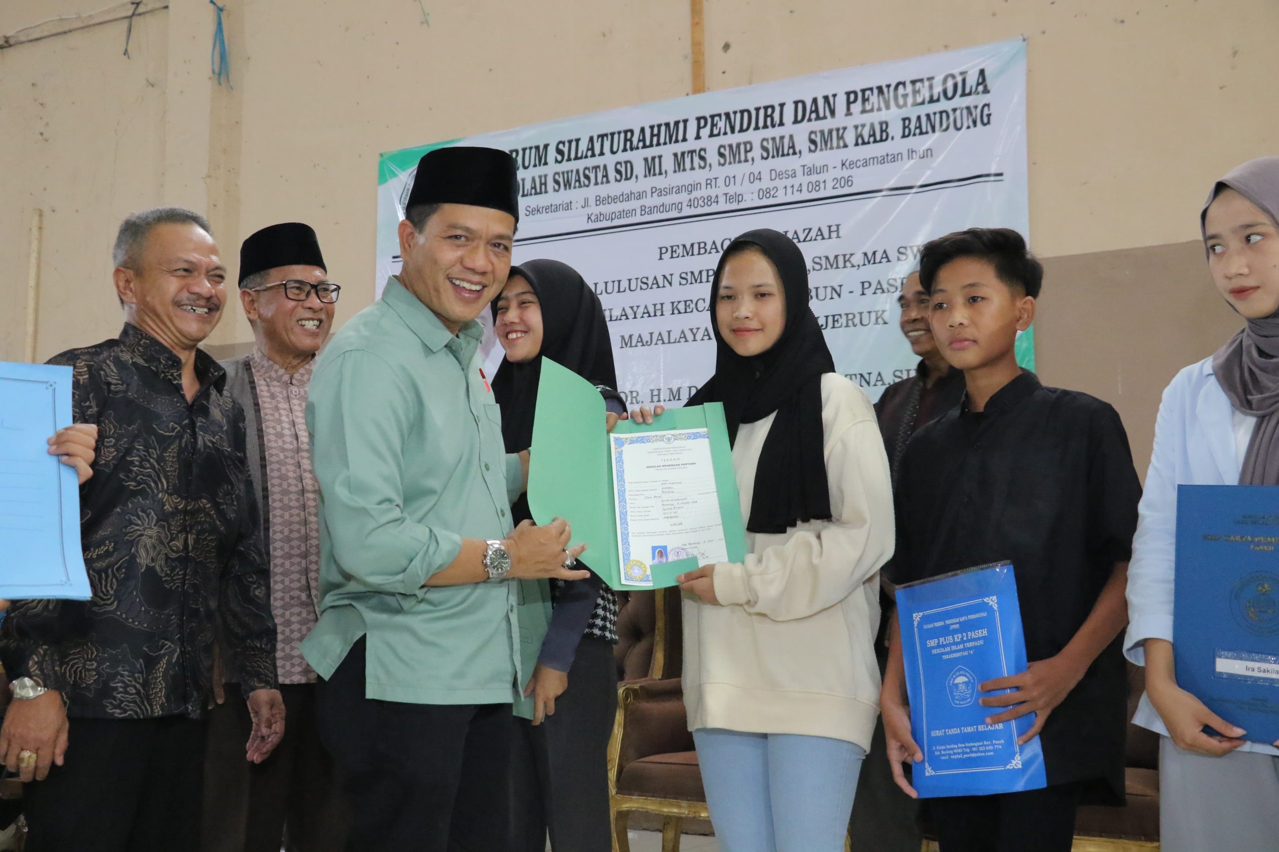 “Alhamdulillah, tiba saatnya, saya selaku Pembina Pendidikan Kabupaten Bandung hadir bersama pimpinan sekolah untuk bersama-sama menyerahkan 2.700 ijazah siswa dan siswi yang ada di wilayah empat kecamatan,” ucap Kang DS.
