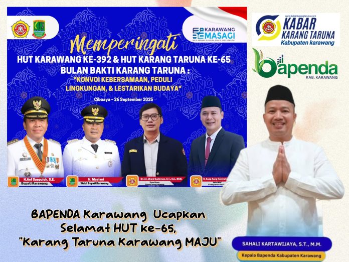 Karawang, Kepala Badan Pendapatan Daerah (BAPENDA) Kabupaten Karawang, Sahali Kartawijaya mengucapkan selamat Hari Ulang Tahun (HUT) ke-65 Karang Taruna! Semoga semangat kepemudaan dan kebersamaan terus menyinari jalan menuju masyarakat yang lebih baik.