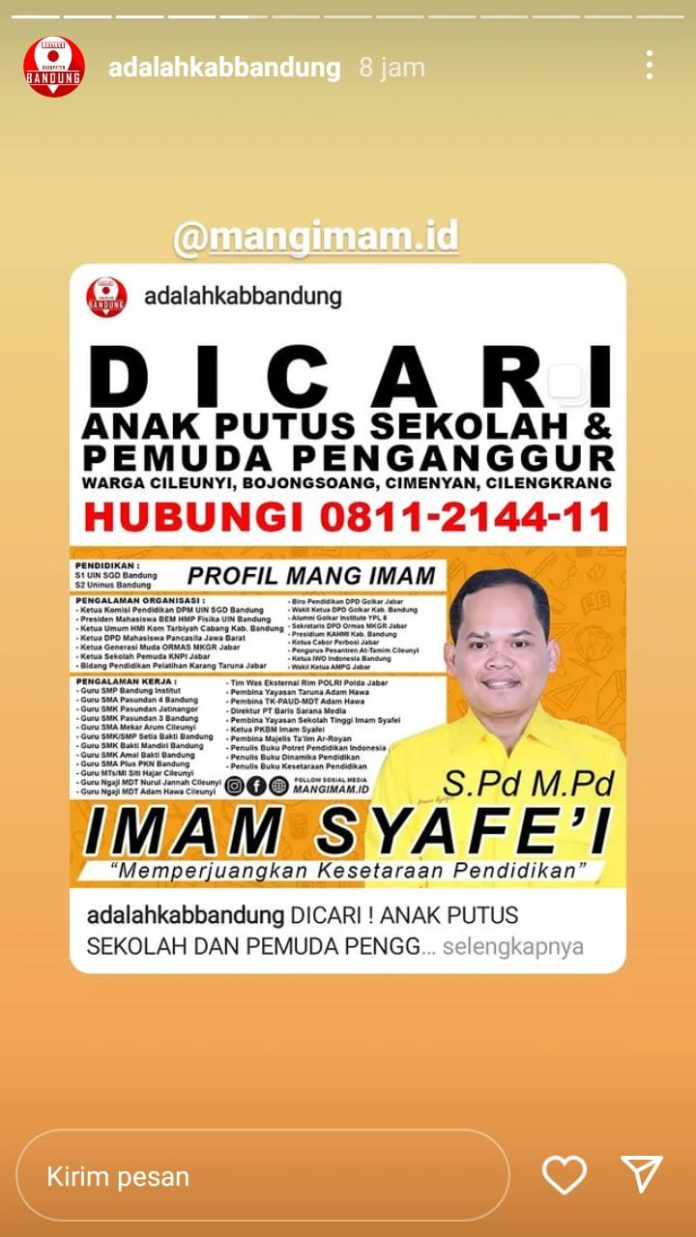 Oleh karena nya Imam Syafei tidak henti hentinya mencari pemuda penganggur dan anak anak putus sekolah. Sebagaimana spanduk yang terpasang dijalan raya cinunuk, Mang imam berkerjasama dengan pihak DU/DI terkait membuka kelas magang dan membuka kelas paket kesetaraan SD SMP dan SMA, semata mata kita sedang bergerak mengurai kemiskinan, ujar Mang Imam Caleg Partai Golkar Kabupaten Bandung.