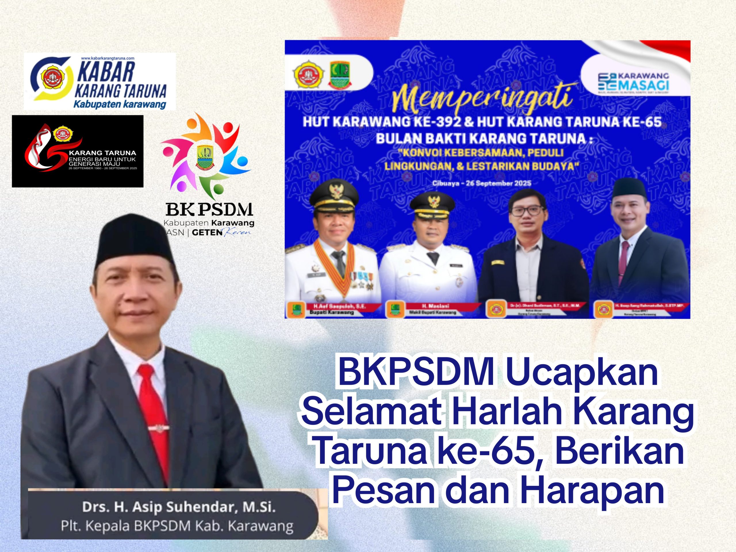 Karawang, Kepala Badan Kepegawaian dan Pengembangan Sumber Daya Manusia (BKPSDM) Kabupaten Karawang, melalui Sekertaris, Gery Sigit Samrodi mengucapkan selamat Hari Lahir (Harlah) Karang Taruna ke-65. BKPSDM berharap Karang Taruna dapat terus menjadi wadah bagi pemuda-pemudi untuk mengembangkan potensi dan kreativitas mereka dalam memajukan masyarakat.