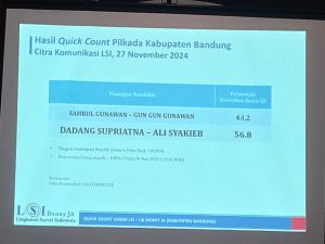 KAB.BANDUNG – BERITASEJABAR.id – Tiga faktor yang membuat pasangan Calon Bupati dan Wakil Bupati Bandung, Dadang Supriatna – Ali Syakieb unggul dengan 56,80%, berdasarkan hasil quick count (hitung cepat) Lingkaran Survei Indonesia (LSI) Denny JA, Rabu (27/11) kemarin. Sementara, lawannya, Sahrul – Gun Gun meraih 43,20%.