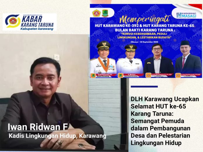 Karawang, Kepala Dinas Lingkungan Hidup Kabupaten Karawang, Iwan Ridwan mengucapkan selamat Hari Ulang Tahun (HUT) ke-65 Karang Taruna! Semoga semangat kepemudaan dan kebersamaan terus menyinari jalan menuju masyarakat yang lebih baik dan lingkungan yang lebih sehat.