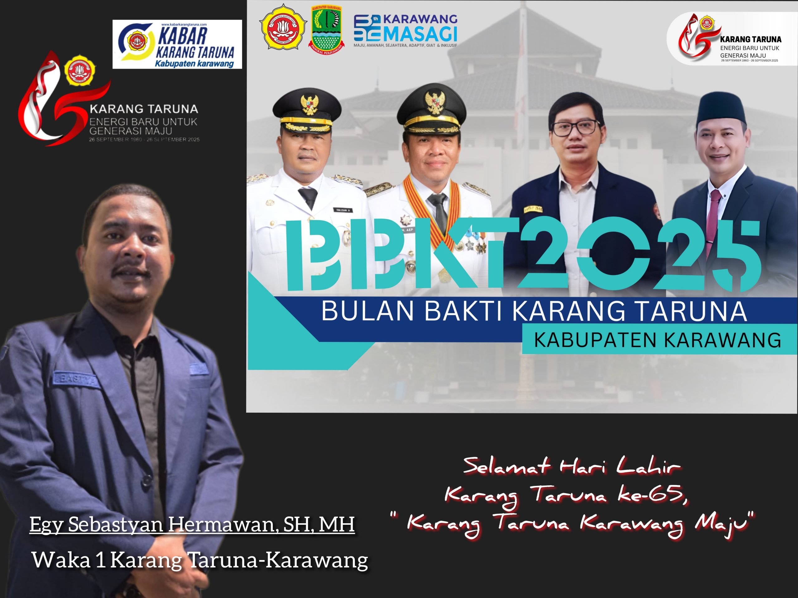 Karawang, Wakil Ketua 1 Karang Taruna Kabupaten Karawang, Egy Sebastyan Hermawan, SH, mengucapkan selamat ulang tahun ke-65 Karang Taruna dan berkomitmen untuk terus mendukung kesejahteraan para pengurus Karang Taruna. Ia juga menyatakan kesanggupannya untuk mengawal program-program yang telah dirancang oleh Ketua Umum Karang Taruna Kabupaten Karawang dalam rangka mendukung program “Karawang Maju”.
