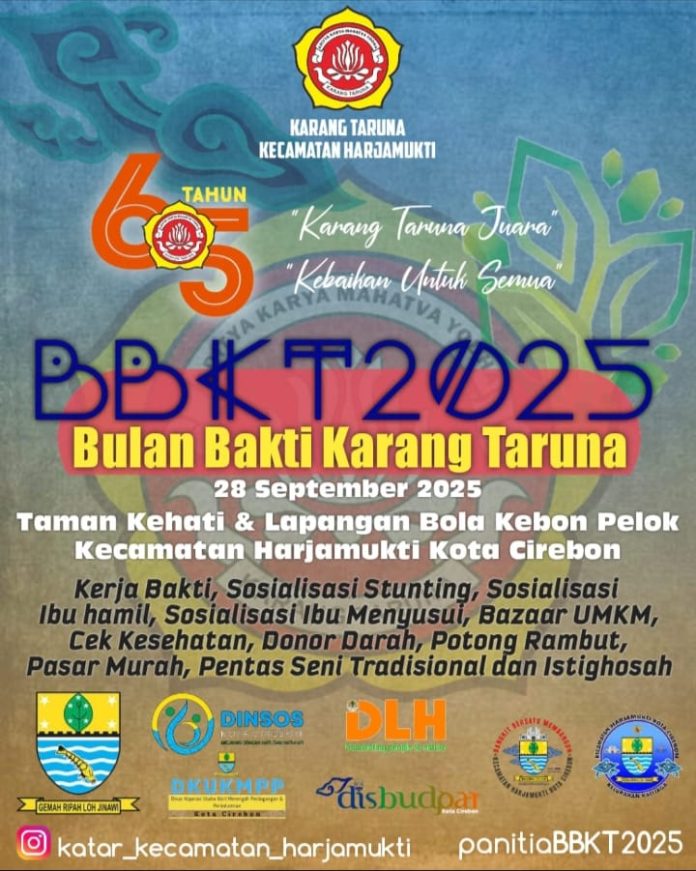 KOTA CIREBON, – Dalam rangka memperingati Hari Ulang Tahun (HUT) ke-65 Karang Taruna yang jatuh setiap 26 September, Karang Taruna Kecamatan Harjamukti Kota Cirebon menggelar Bulan Bakti Karang Taruna (BBKT) 2025 pada Minggu, 28 September 2025. Kegiatan dipusatkan di Taman Kehati dan Lapangan Bola Kebon Pelok, Kecamatan Harjamukti.