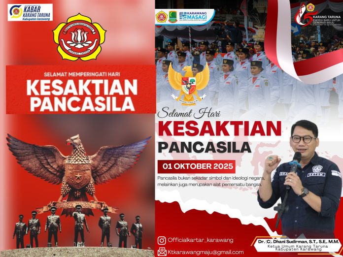 “Semangat Pancasila harus terus menyala dalam jiwa kita semua! Selamat Hari Kesaktian Pancasila, 1 Oktober 2025. Mari kita jadikan momentum ini untuk memperkuat komitmen kita sebagai generasi muda yang tangguh dan peduli terhadap bangsa.” ungkap Ketua Umum Karang Taruna Kab. Karawang. Dhani Sudirman