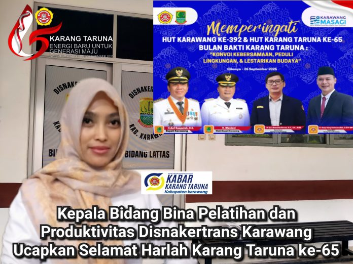 Karawang, Kepala Bidang Bina Pelatihan dan Produktivitas (Lattas) Disnakertrans Karawang, Puspita Wulansari, SH., MH., mengucapkan selamat Hari Lahir (Harlah) Karang Taruna ke-65 dan memberikan semangat kepada pemuda untuk terus berkontribusi dalam pembangunan masyarakat.