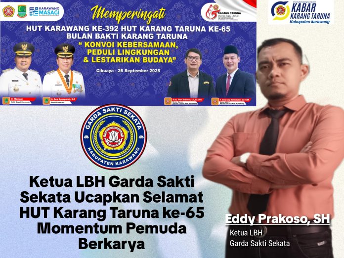 Karawang, Eddy Prakoso, SH, Ketua Lembaga Bantuan Hukum (LBH) Garda Sakti Sekata, mengucapkan selamat Hari Lahir Karang Taruna ke-65. Dalam kesempatan ini, ia pun memberikan semangat kepada para pemuda untuk terus berkontribusi dalam pembangunan bangsa dan meningkatkan kualitas hidup masyarakat.