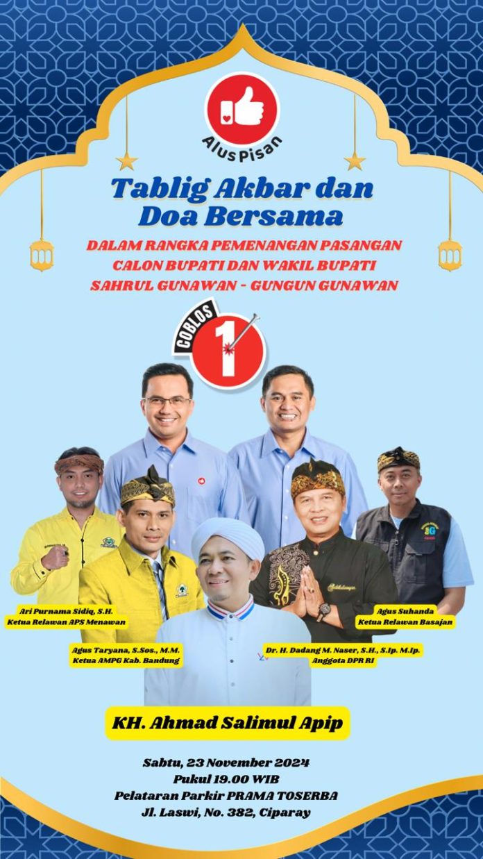 Bandung, 23 November 2024 – Penutup kampanye pasangan calon kepala daerah Sahrul-Gun Gun dari Koalisi Rakyat ALUS PISAN berlangsung penuh khidmat dan meriah. KH. Salimul Apip, tokoh kiyai di kabupaten bandung, memimpin sholawat akbar yang diikuti ribuan pendukung di halaman mesjid Al-Karomah ciparay, Jumat malam. Acara ini menjadi puncak dari rangkaian kegiatan kampanye pasangan yang dikenal dengan slogan Bandung Menawan Alus Pisan.