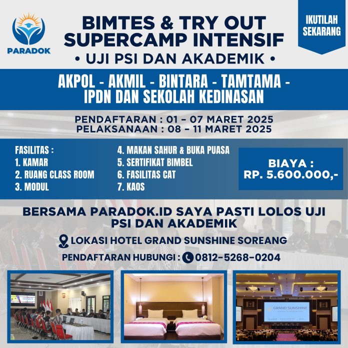 Badapun agenda terdekat yaitu BIMTES & TRY OUT SUPERCAMP INTENSIF UJI PSI DAN AKADEMIK AKPOL – AKMIL – BINTARA – TAMTAMA -IPDN – SEKOLAH KEDINASAN