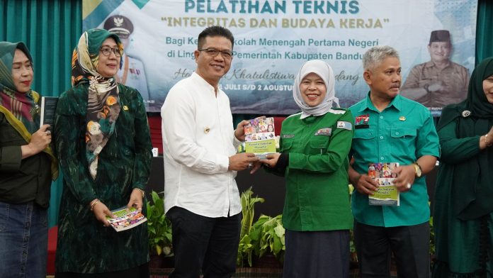 Saya merasa bangga dan bersyukur karena pelatihan ini telah berlangsung dengan sukses dan lancar. Kegiatan ini bukan hanya merupakan sebuah kesempatan untuk memperdalam pengetahuan dan keterampilan saja, tetapi juga sebagai upaya strategis dalam memperkuat integritas dan budaya kerja di lingkungan pendidikan Pemkab Bandung,” tutur Bupati Bandung.