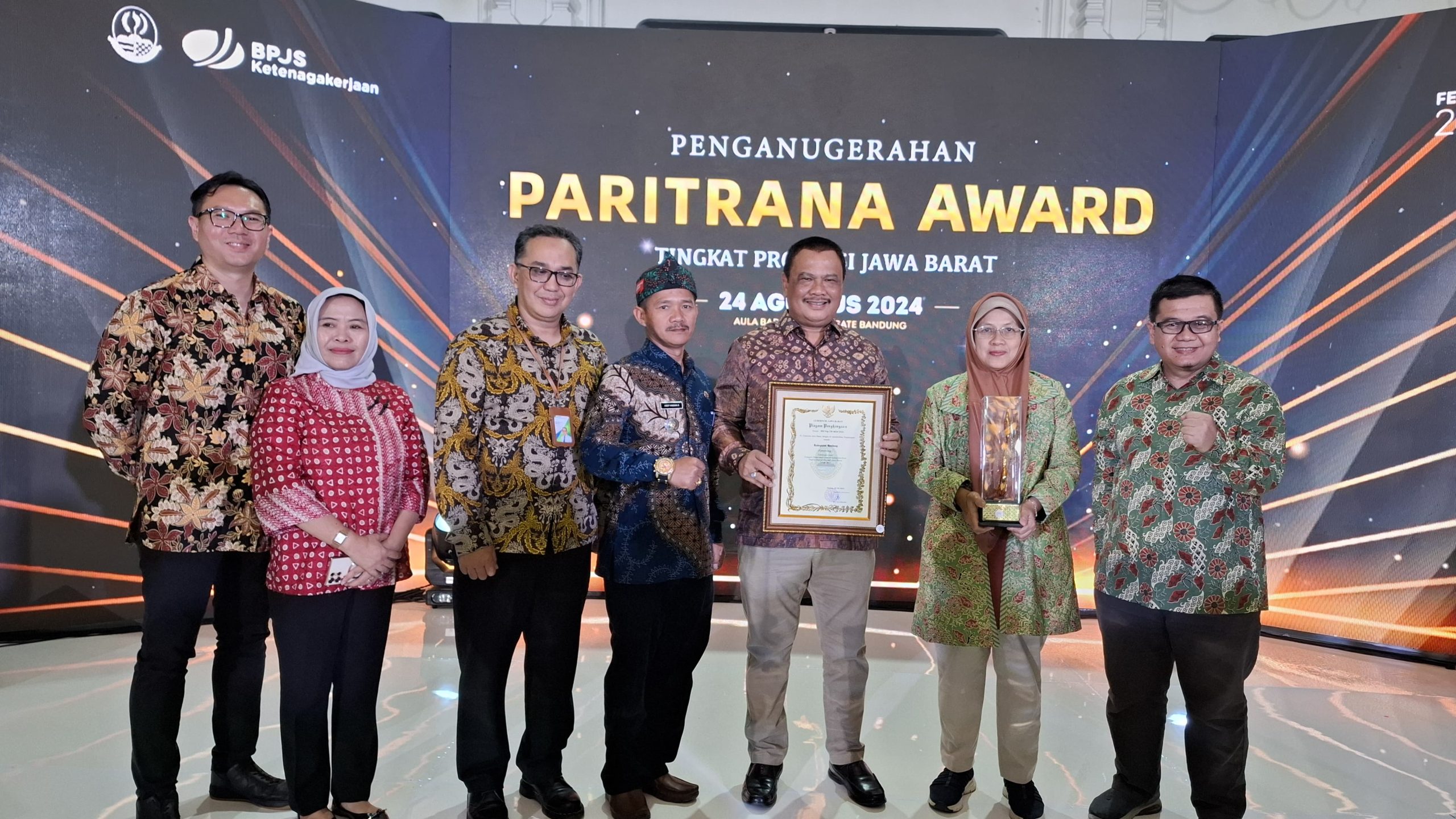 Kepala Dinas Ketenagakerjaan Kabupaten Bandung, Rukmana mewakili Bupati Bandung Dadang Supriatna menerima penganugerahan penghargaan Paritrana Award 2023 tingkat Provinsi Jawa Barat yang diserahkan oleh PJ. Gubernur Bey Machmudin dan Kakanwil BPJS Ketenagakerjaan Romie Erfianto bertempat di aula barat Gedung Sate, Sabtu 24/8/24.