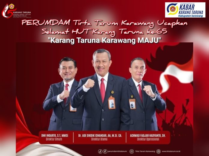 Karawang, Jajaran Direksi dan Karyawan PERUMDAM Tirta Tarum Karawang mengucapkan selamat Hari Ulang Tahun (HUT) Karang Taruna ke-65. Kami berharap Karang Taruna dapat terus menjadi wadah bagi pemuda untuk mengembangkan potensi dan kreativitas mereka dalam memajukan masyarakat.