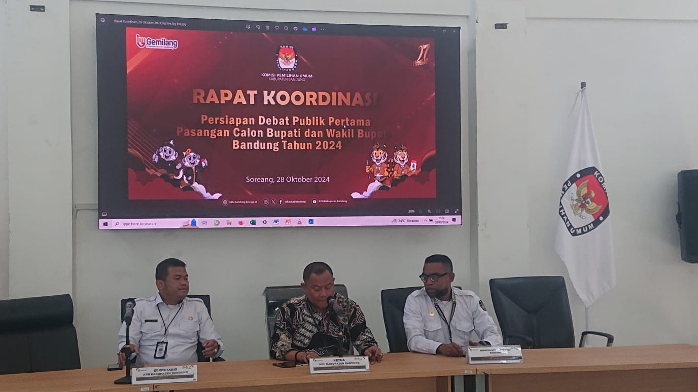 Ketua KPU kabupaten Bandung, Syam Zamiat Nursyamsi, S.Pdi, didampingi Anggota Divisi Sosialisasi Pendidikan Pemilih, Partisipasi Masyarakat dan SDM, Abdur Rozaq, dan Sekretaris KPU Kabupaten Bandung, Enda Kurniawan SH, menyampaikan bahwa Rakor digelar guna memastikan semua persiapan teknis dan substansi debat berjalan lancar serta sesuai dengan aturan yang berlaku.