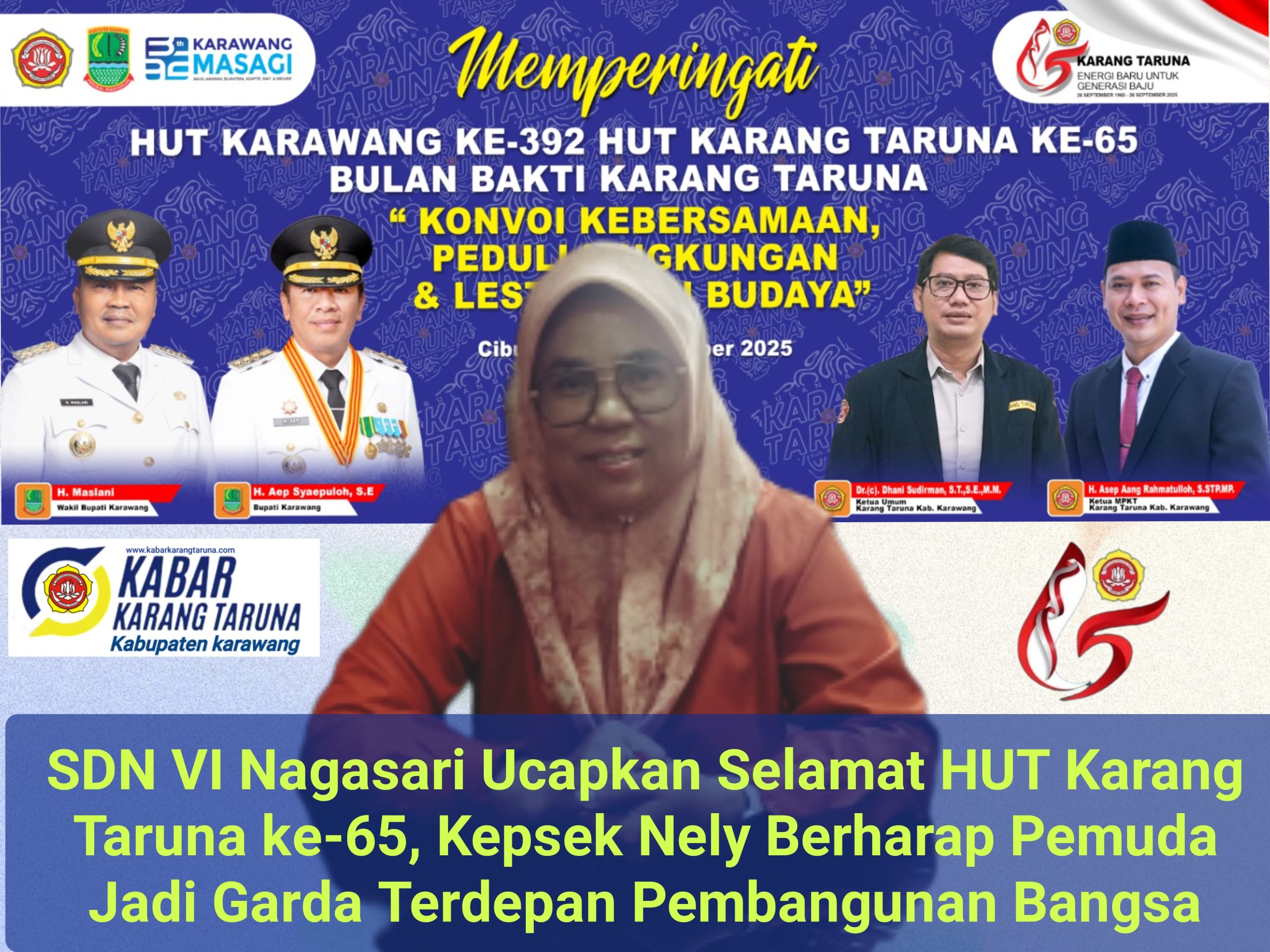 Karawang, Kepala Sekolah Dasar Negeri Nagasari VI, kecamatan Karawang Barat. Nelly Kania Lasmi, S.Pd, mengucapkan selamat Hari Ulang Tahun Karang Taruna ke-65. Dalam kesempatan ini, beliau menyampaikan pesan dan harapan bagi para pemuda untuk terus berkontribusi dalam pembangunan bangsa.